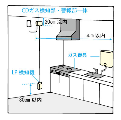 LPガスは、空気より重い(空気の1.5~2倍)ので万一漏洩した場合、床面をはうように広がり、低い場所にたまる性質があります。このことから、ガス漏れ警報器を床面から30cm以内の高さの所に取り付けておくと、爆発下限界濃度2.1%の約4分の1の0.5%で検知して警報を発します。